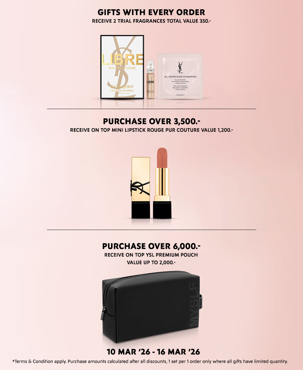 Discover YSL Beauty's extensive collection of best-selling makeup, fragrance and skincare for the perfect beauty routine for you and your loved ones. Enjoy free delivery for every order, with free samples available for certain collections. Our YSL Beauty Club is also the perfect way to gain exclusive rewards and benefits by earning points every time you shop online or at one of our department store counters - nationwide. Join the YSL Beauty Club today for exclusive offers, rewards and the ultimate members-only experience at YSL Beauty Thailand.