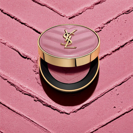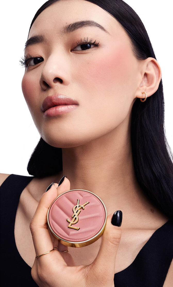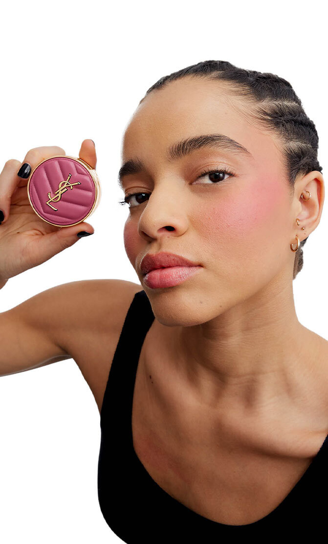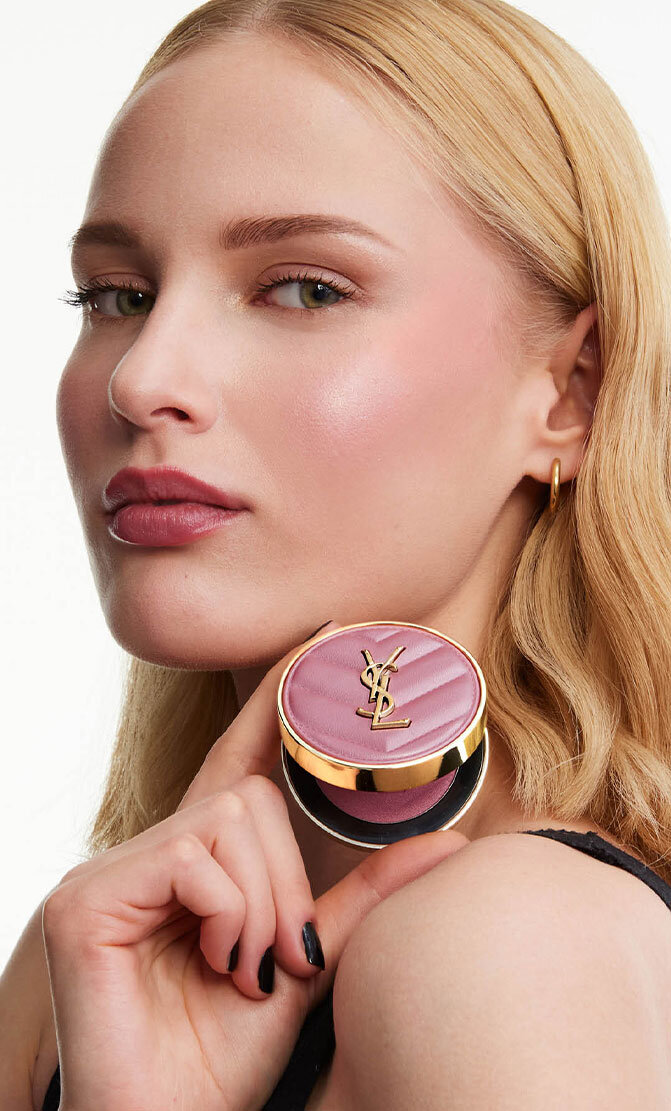 Each shade of the Make Me Blush Bold Blurring Blush is packaged in a couture compact, adorned with the iconic YSL Cassandre logo on an embossed leather case, embellished with the brand's signature chevron pattern.